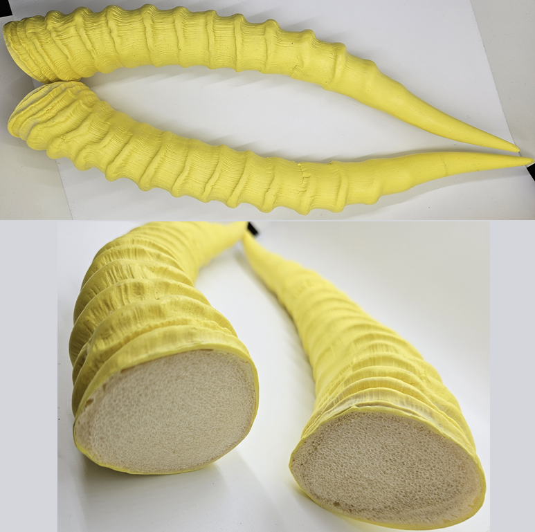 Replicas of real horns, these weigh only a few ounces; much lighter than the real thing! However since they are made from natural horns, there can be differences in size/symmetry/details.
